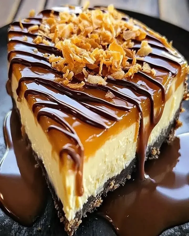 Cheesecake Samoa Irrésistible: dessert crémeux au caramel, coco et chocolat — rapide, facile et parfait pour réunir famille et amis gourmands. Essayez!