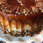 Assembler : Une fois le gâteau refroidi, étalez la crème pralinée sur le dessus et décorez avec des pécans entiers pour une touche finale majestueuse !