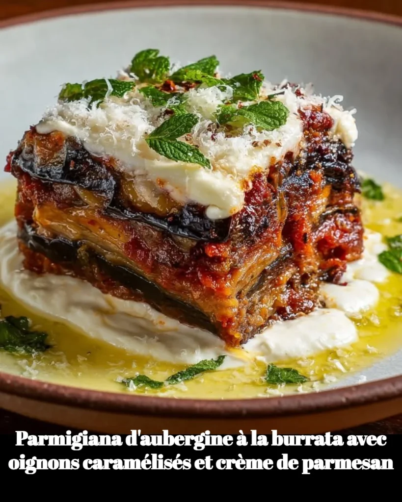Parmigiana d’aubergine à la burrata avec oignons caramélisés et crème de parmesan : Un Plat Réconfortant à Essayer !