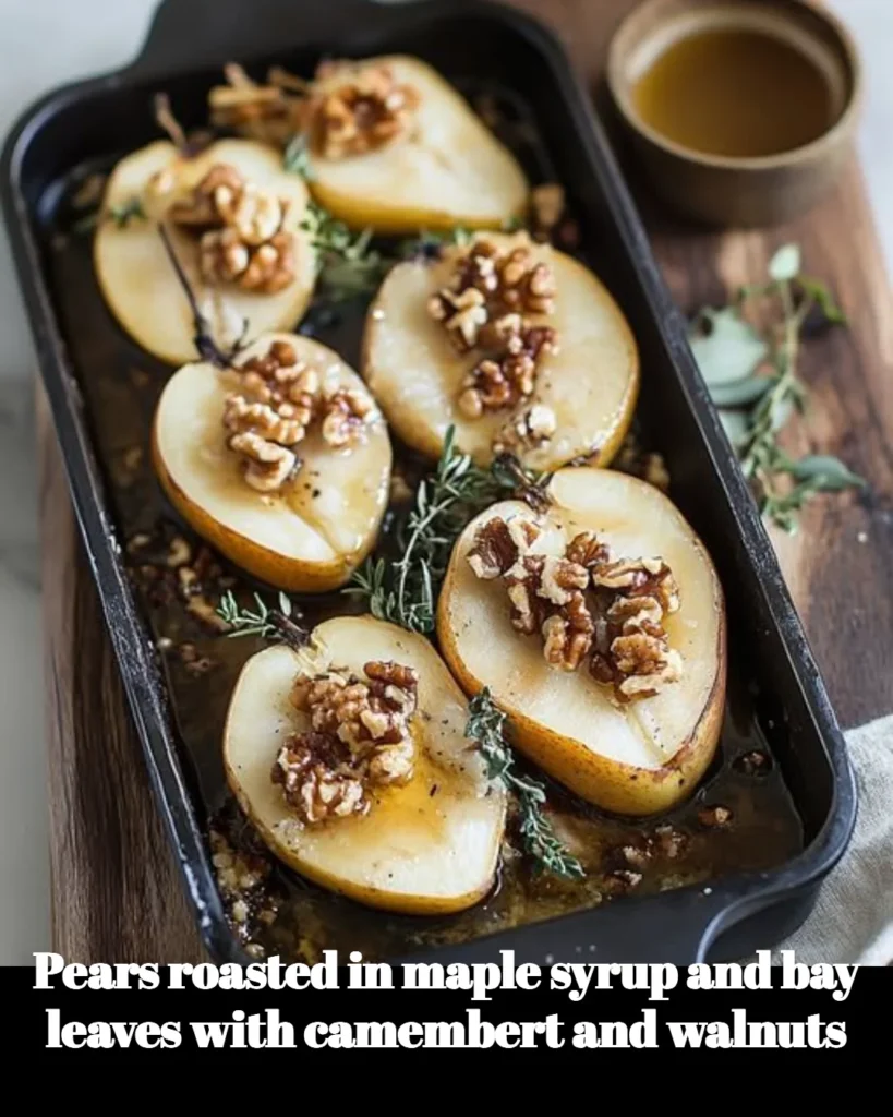 Pears Roasted in Maple Syrup and Bay Leaves with Camembert and Walnuts