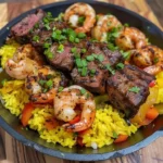 Meta Description: Steak and Jerk Shrimp on Yellow Rice is the perfect recipe for busy evenings. Quick, easy, and delicious, this dish will impress everyone!